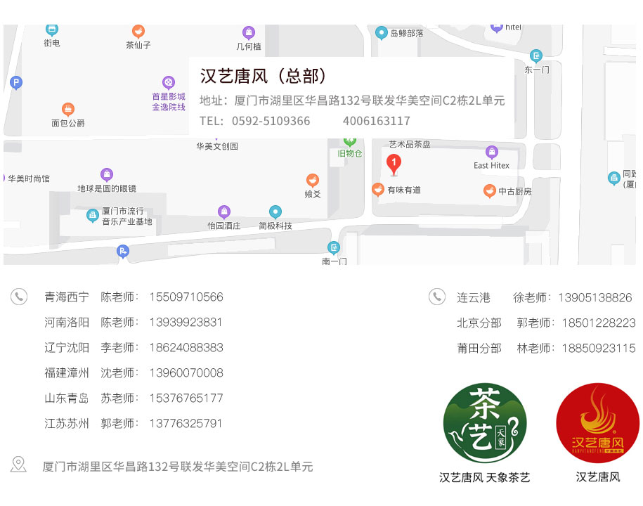 厦门汉艺唐风文化传播有限公司(简称:汉艺唐风),2009年由林燕玲女士创办,目前在全国各地(梅州、泉州、福清、广州、莆田、晋江、泉港、西宁、信阳、洛阳、北京、沈阳、漳州、苏州、连云港、青岛)共设立16个分部,已培养出学员逾万人;是一家主要以研究、传承、传播和推广中国茶文化的综合性文化传播机构。